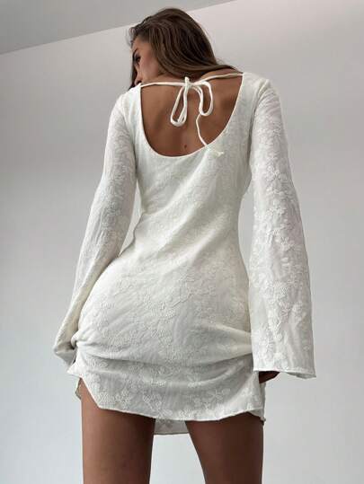 Aloruh 全新优雅提花露背喇叭袖迷你连衣裙 - 白色 - 查看 1