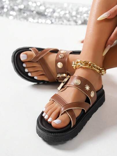 新款时尚金属扣装饰厚底坡跟拖鞋,舒适防滑,百搭易清洁,适合日常穿着。 - 棕色 - 查看 1