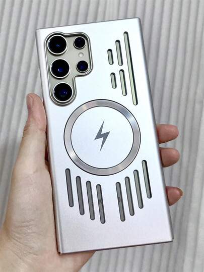 新款镂空透气散热闪电纹磁吸无线充电手机壳,兼容三星 Galaxy S26 Ultra、S25 Ultra、S24 Ultra、S23 Ultra、S22 Ultra、S26、S25、S24 Plus,奢华全包金属漆面触感磨砂保护后盖 - 銀色 - 查看 1