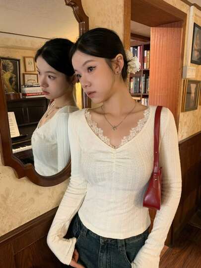 全新蕾丝长袖打底 T 恤,V 领,修身,短款 - 杏色 - 查看 10