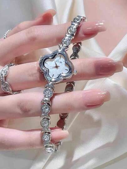新款奢华闪耀水晶镶嵌复古优雅时尚女表,个性化珍珠表盘,石英机芯,适合日常佩戴、派对、度假等各种场合,腕间装饰 - 銀色 - 查看 1