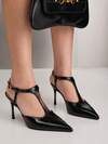 女式黑色漆皮尖头小猫跟高跟鞋,优雅正式时尚包头派对正装鞋,带踝带