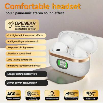 NEW SENYANG 森阳新款真无线蓝牙半入耳式耳机 - HiFi 立体声,杜比音效,TWS 真无线连接,触控操作,背光显示,适用于安卓和苹果手机,白色和金色设计,USB-C 充电,情人节礼物之选 - 均碼 - 查看 2