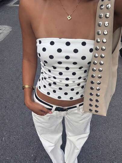 新款性感波点印花褶皱抹胸上衣,露脐上衣 - 白色 - 查看 1