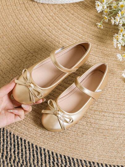 新風格女孩柔軟的舒服的鞋底表現鞋帶蝴蝶結適用於大兒童,時尚平底鞋適用於服飾和學校在秋天和冬天 - 金色 - 查看 1