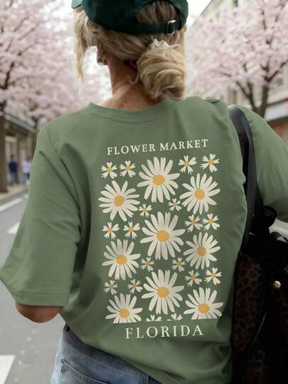 新款夏季女式简约彩色向日葵花卉字母印花圆领短袖T恤,时尚百搭,适合女士上衣、度假和春假穿着。 - 草綠 - 查看 4