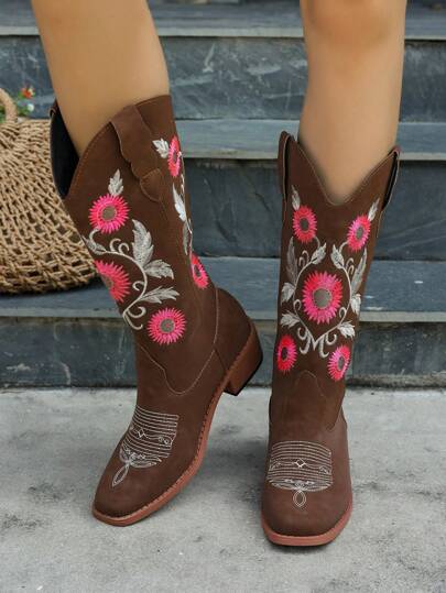 新款复古西部风格刺绣骑士靴,女士中筒靴,牛仔靴 - 棕色 - 查看 1