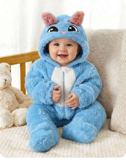 新生儿可爱卡通刺绣3D护耳拉链抓绒连体衣,秋冬季 - 藍色 - 查看 1