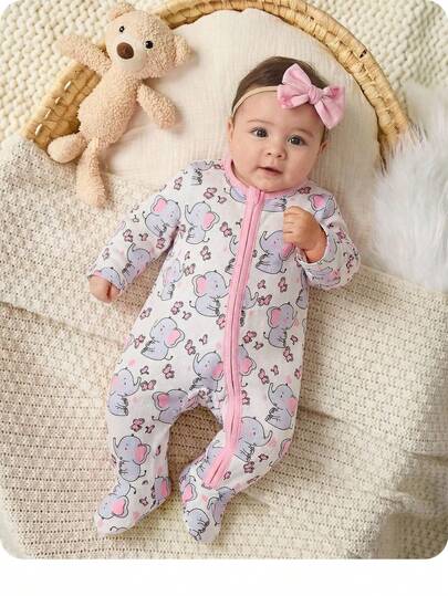 新生女宝宝可爱休闲针织大象图案连体衣 - 彩色 - 查看 1