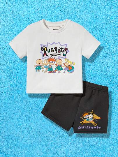 Nick 90s | SHEIN 嬰兒男童卡通人物圖形t恤和短褲套裝 - 黑與白 - 查看 1