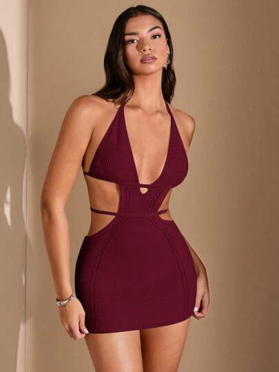SHEIN BAE 白色露背针织迷你连衣裙、钩针比基尼、性感服装、沙滩女装、波西米亚风、夏季女装 - 酒紅色 - 查看 1