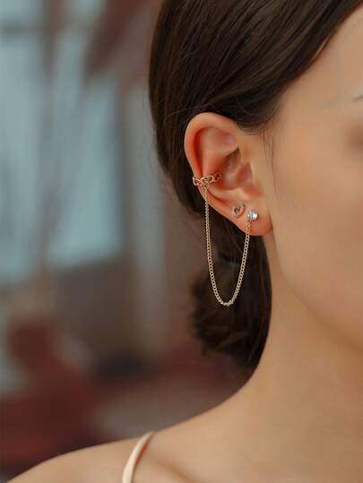 2件套极简耳骨穿刺耳环套装,女士C形铜耳骨夹配心形立方氧化锆耳钉,礼品