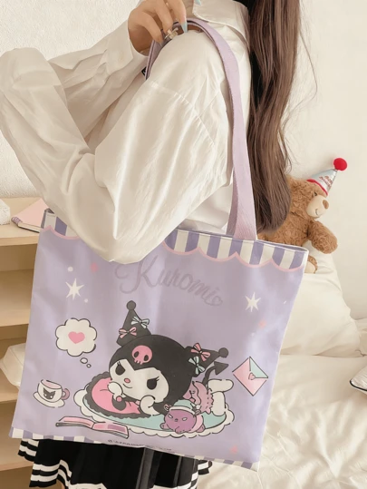 Official  Purple Canvas Shoulder Tote Bag, Cute Kawaii Cloud-Themed Character Print, Spacious Large Capacity, Comfortable Wide Shoulder Straps, Stylish Purple Striped Trim, Lightweight Portable Design, For Teen Girls/Students/Young/Santosok, Daily /Sanrios/Scht/Schals/Schrok/Sanrios, Daily/Sanrios, Daily/Sfloo Birthday/Holiday Gift - 庫洛米 - 查看 1
