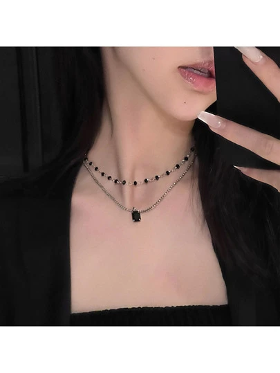 女士用一條雙層黑鑽石項鍊,INS時尚簡約奢華鎖骨鏈頸鏈黑蝴蝶 - 黑色 - 查看 1