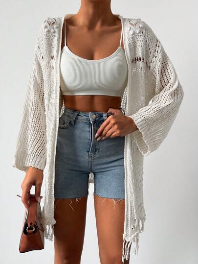 Cottnline 开放式针织流苏下摆落肩和服,适合夏季海滩度假 - 白色 - 查看 1