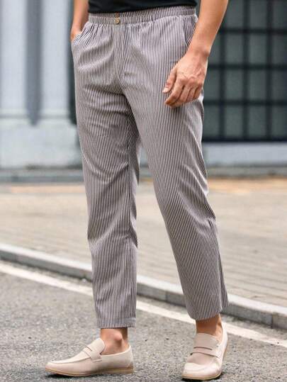 Manfinity VCAY 男士休闲梭织条纹中腰纽扣装饰锥形裤 - 彩色 - 查看 1