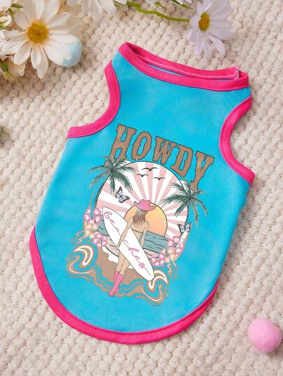 PETSIN 1件冲浪板沙滩椰子树字母印花宠物背心蓝色拼接红色柔软透气防掉毛宠物服装