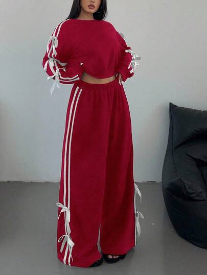 POPSWAY 2 件大码拼接条纹蝴蝶结装饰可爱休闲黑色运动衫套装,秋季 - 紅色 - 查看 1