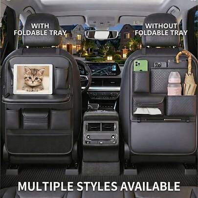 PU皮革汽车座椅靠背收纳袋,带可折叠托盘/桌面,多口袋后座收纳袋,带平板电脑/笔记本电脑支架和杯架,通用座椅靠背保护垫,适用于SUV和轿车,黑色汽车旅行配件礼品
