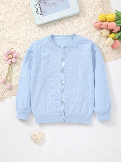 女童纯色薄款长袖镂空针织纽扣开衫斗篷,春夏 - 淺藍色 - 查看 1