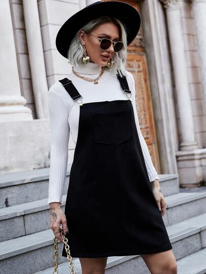 補丁貼口袋麂皮背帶裙 - 黑色 - 查看 1