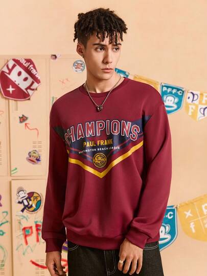 Paul Frank X SHEIN 男式字母图案圆领长袖套头衫 - 酒紅色 - 查看 1
