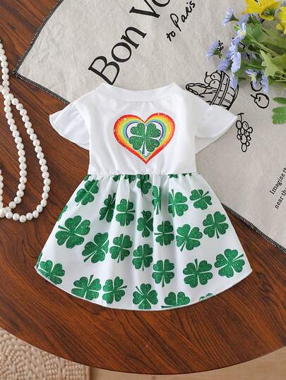 宠物连衣裙,饰有彩虹爱心和三叶草图案,白色荷叶袖,腰部收紧,适合日常穿着。 - 白色 - 查看 1