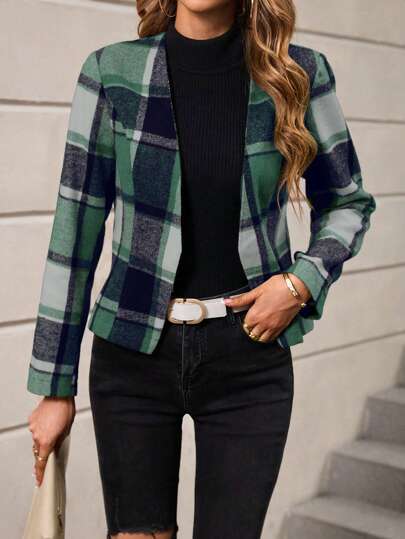 SHEIN Clasi 格紋短款休閒夾克 - 綠色 - 查看 1