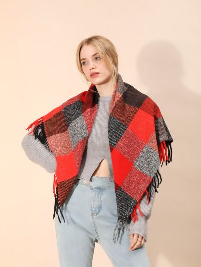 格紋圖案流蘇邊圍巾 - 紅色 - 查看 1