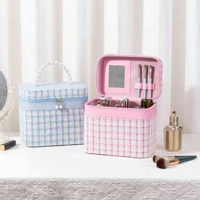 格子珍珠手柄化妆包带镜子,大容量PU皮革旅行化妆品收纳包,防水便携式洗漱包,粉蓝格子化妆品收纳盒