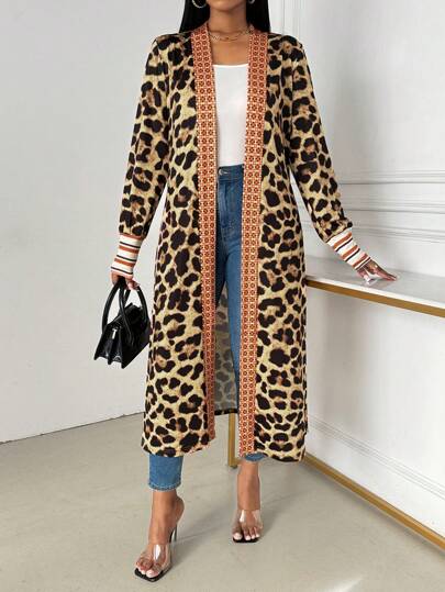 SHEIN Clasi 女士豹纹拼布长袖休闲开衫 - 卡其色 - 查看 1