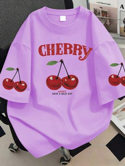 大码女式樱桃字母印花圆领T恤,适合夏季度假、新年礼物、情人节礼物、日常穿着、外出、节日、海滩、派对、生日、聚会、学校、音乐节、度假、通勤、健身、婚礼、外套、沙滩装、度假装、春季装、母亲节礼物;母亲节礼物;女士夏季装、女士假日休闲装