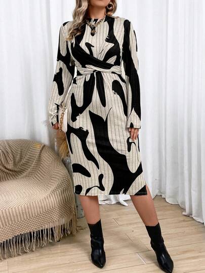 Flirla 大碼滿版印花繫腰帶洋裝 - 彩色 - 查看 1