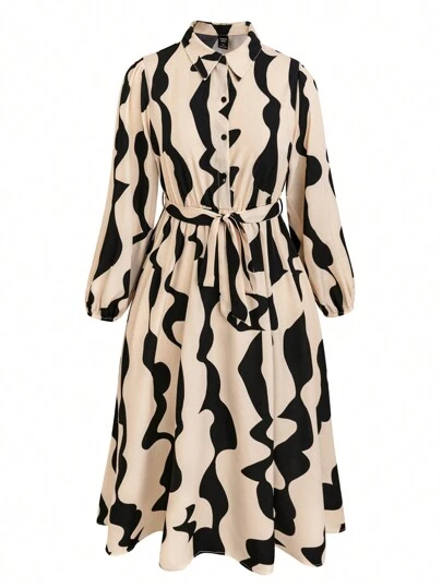 SHEIN Clasi 大碼滿版印花腰帶襯衫洋裝 - 杏色 - 查看 1