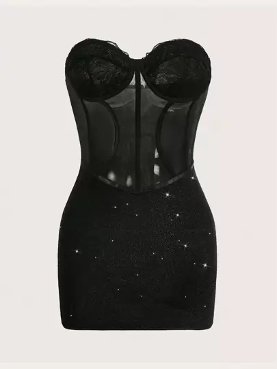 SHEIN ICON 大碼網紗拼接緊身上衣抹胸緊身連衣裙 - 黑色 - 查看 1