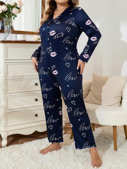 鈕扣繪圖大碼睡衣連體褲 - 藍色 - 查看 1