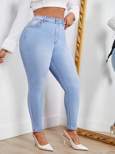 SHEIN SXY 大碼高腰緊身牛仔褲 - 淺色水洗藍 - 查看 1