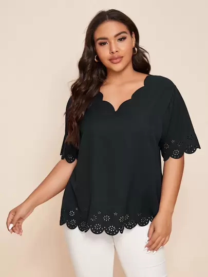 大碼鐳射剪裁貝殼邊襯衫 - 黑色 - 查看 1