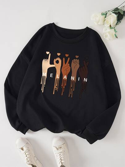 SHEIN LUNE Plus 字母和手写印花热敏套头衫秋季 - 黑色 - 查看 1