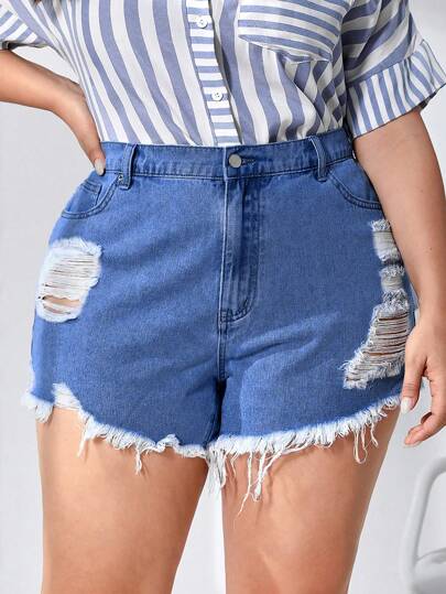 大碼破洞毛邊牛仔短褲 - 中等水洗藍 - 查看 1
