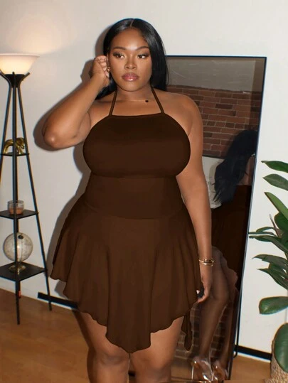 Slaydiva 大码不对称下摆系带紧身连衣裙 - 棕色 - 查看 1