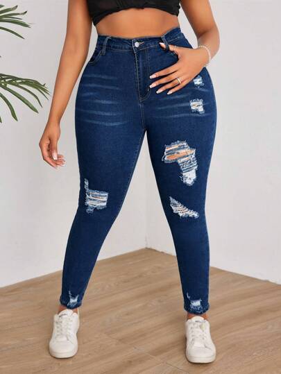 SHEIN SXY 大尺碼破洞修身牛仔褲 - 深色水洗藍 - 查看 1