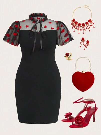 Ellevyn 大码优雅情人节心形网布和植绒拼布修身连衣裙 - 彩色 - 查看 1
