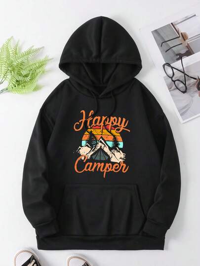 大尺碼文字印花連帽落肩運動衫 - 黑色 - 查看 1