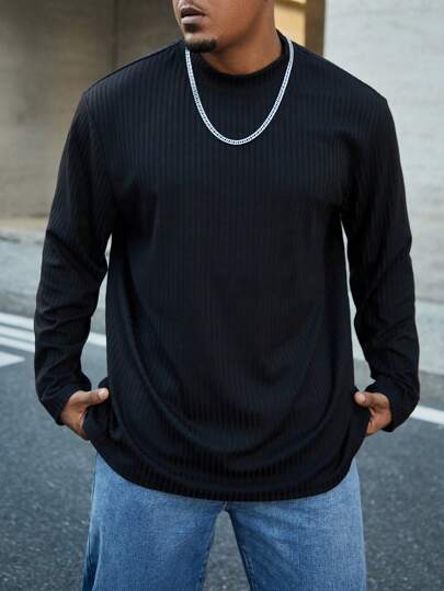 Manfinity Homme 大码男士休闲纯色条纹长袖衬衫,适合外出 - 黑色 - 查看 1