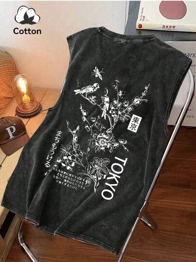 加大码男士镂空十字架及英文字母印花休闲无袖背心,Y2K街头风,适合日常穿着 - 黑色 - 查看 1