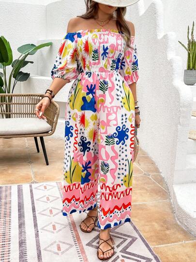 Breezaya 大尺碼露肩全印花短袖連身褲 - 彩色 - 查看 1