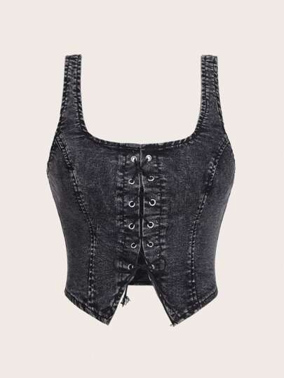 SHEIN MOD 大码无袖做旧交叉带牛仔上衣 - 黑色 - 查看 1