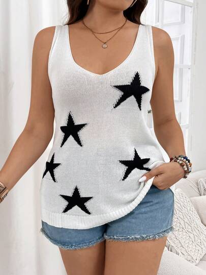 Calvaya 加大尺碼無袖針織上衣,星星印花圖案,夏季休閒 - 白色 - 查看 1