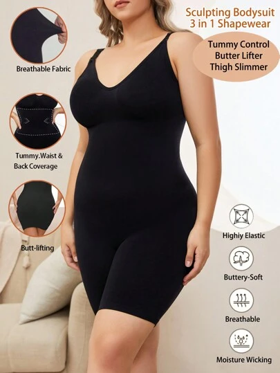 加大码纯色塑身连体衣细肩带 - 黑色 - 查看 1